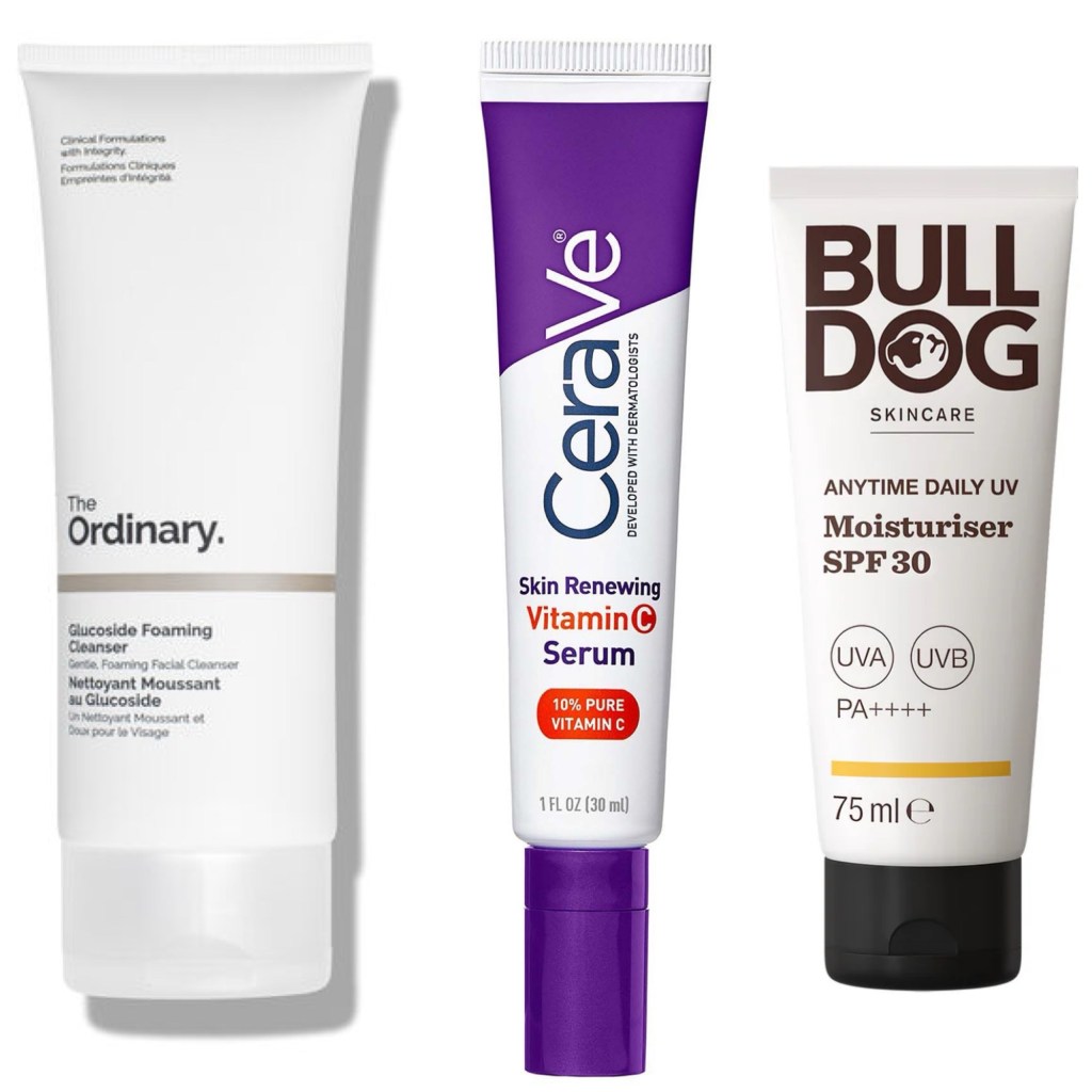 The Ordinary Foaming Cleanser (£11) → CeraVe Vitamin C Serum (£25) → Bulldog Daily Moisturiser SPF 30 (£12)
